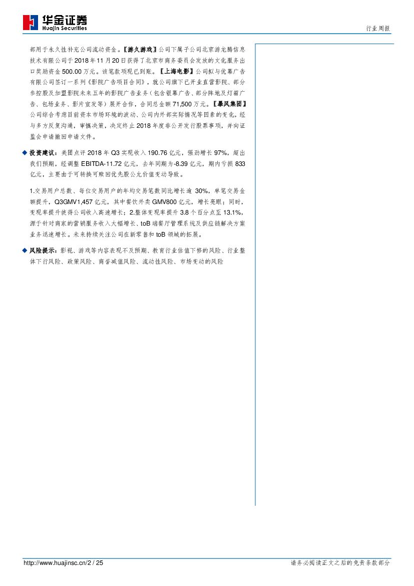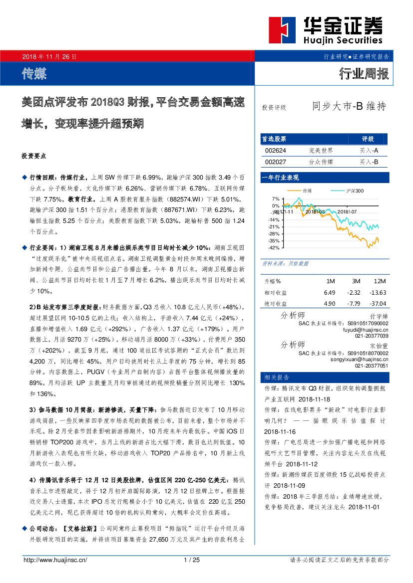 华金证券:传媒行业周报:美团点评发布2018Q3财报,平台交易金额高速增长,变现率提升超预期.pdf
