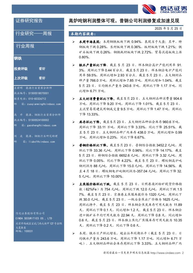 信达证券:高炉吨钢利润整体可观,普钢公司利润修复或加速兑现钢铁.pdf