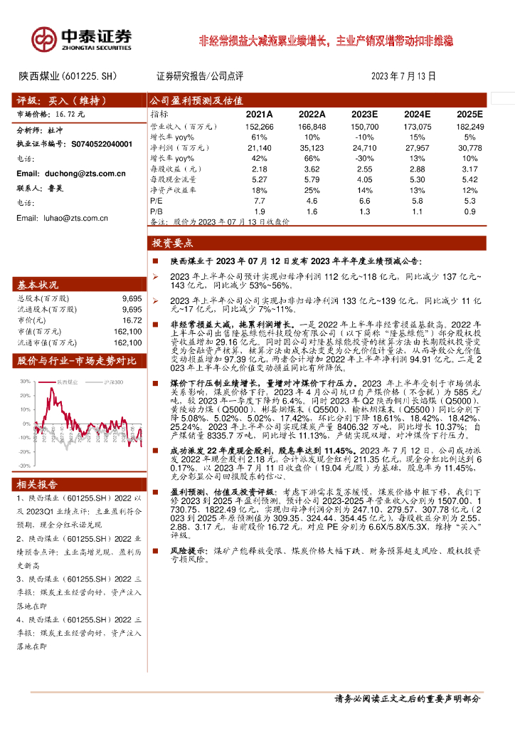 中泰证券:陕西煤业(601225)-非经常损益大减拖累业绩增长,主业产销双增带动扣非维稳.pdf