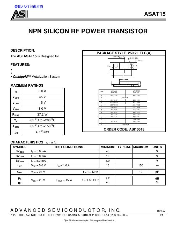 ASI ASAT15 NPN SILICON RF POWER TRANSISTOR 数据手册.pdf