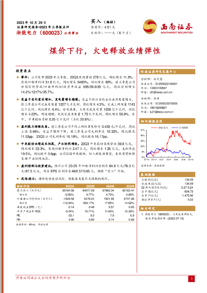 西南证券:浙能电力(600023)-2023年三季报点评:煤价下行,火电释放业绩弹性.pdf