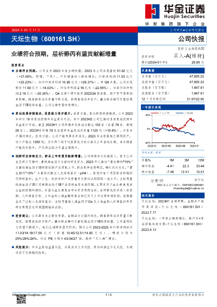 华金证券:天坛生物(600161)-业绩符合预期,层析静丙有望贡献新增量.pdf