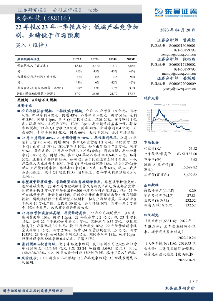 东吴证券:天奈科技(688116)-22年报&23年一季报点评:低端产品竞争加剧,业绩低于市场预期.pdf