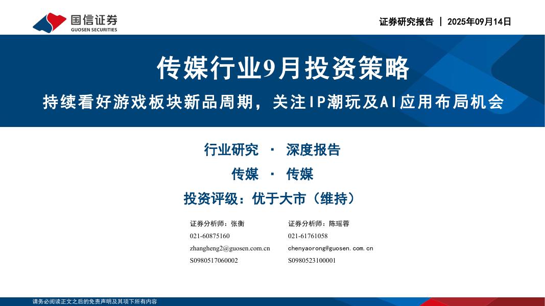 国信证券:传媒行业9月投资策略:持续看好游戏板块新品周期,关注IP潮玩及AI应用布局机会.pdf