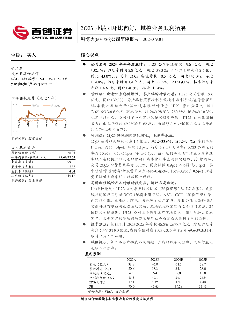 首创证券:科博达(603786)-公司简评报告:2Q23业绩同环比向好,域控业务顺利拓展.pdf