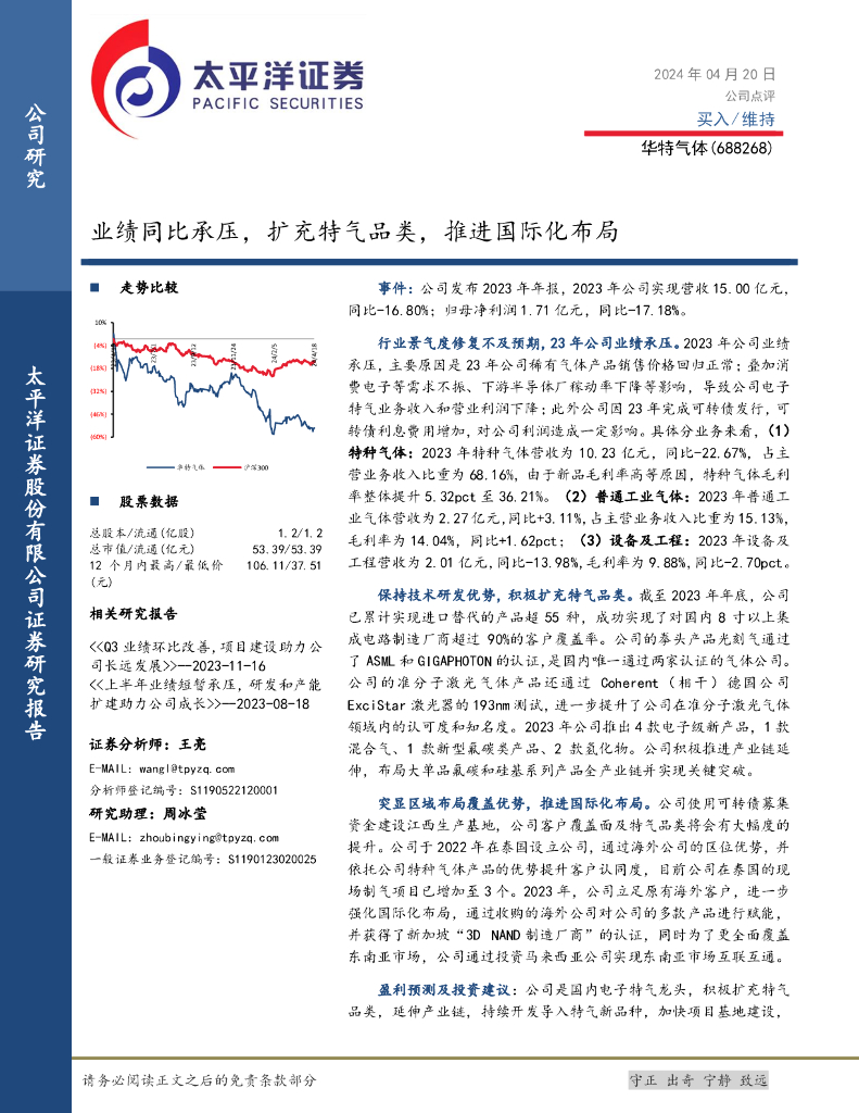 太平洋证券:华特气体(688268)-业绩同比承压,扩充特气品类,推进国际化布局.pdf