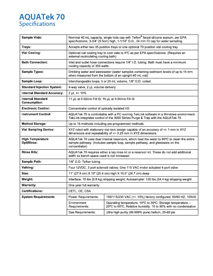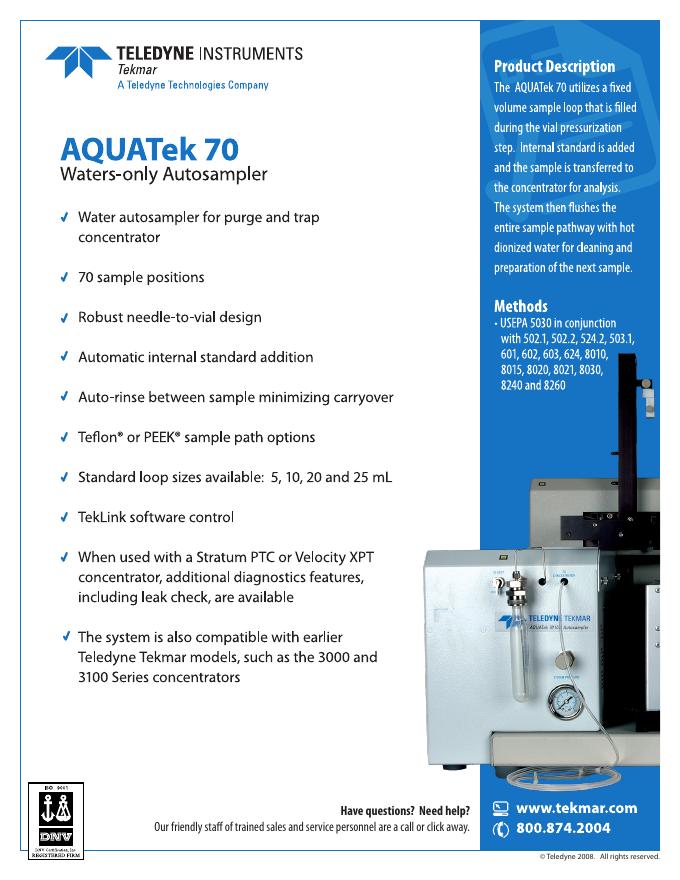 Teledyne Tekmar AQUATek 70 Data Sheet 数据手册.pdf