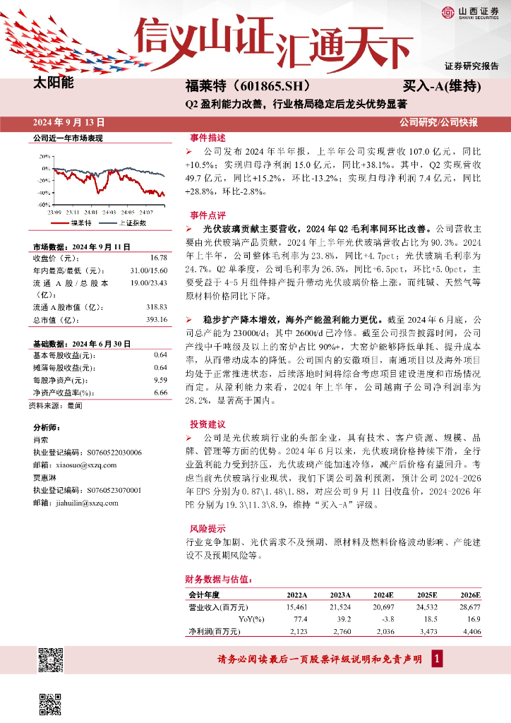 山西证券:福莱特(601865)-Q2盈利能力改善,行业格局稳定后龙头优势显著公司研究/公司快报.pdf
