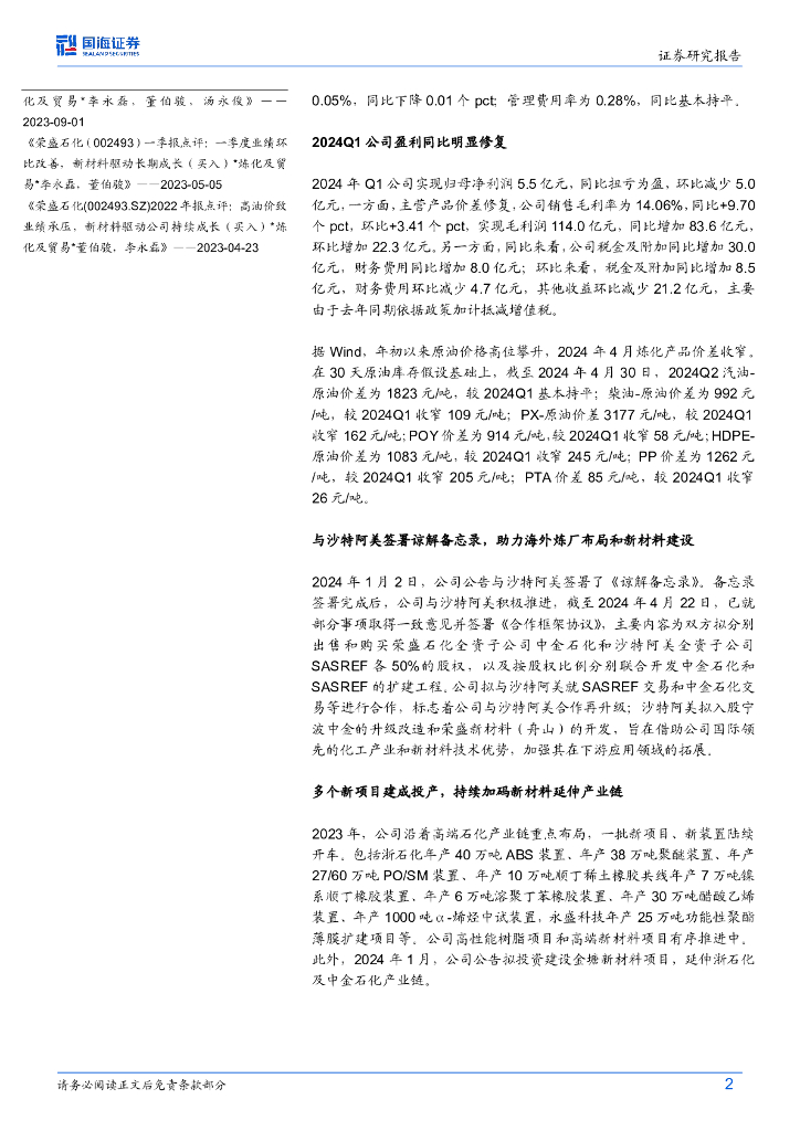 国海证券:荣盛石化(002493)-2024Q1盈利同比修复,新材料项目助成长.pdf