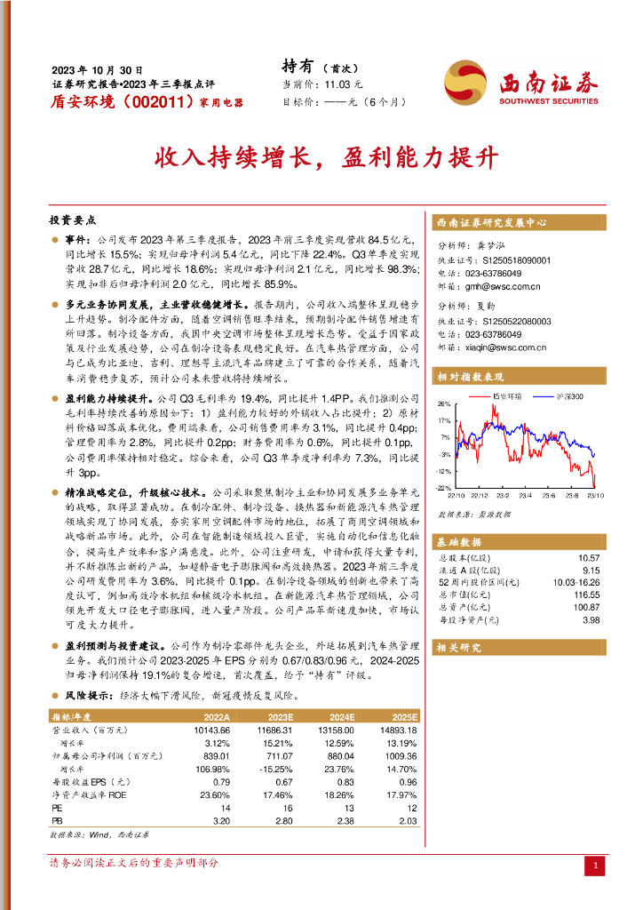 西南证券:盾安环境(002011)-2023年三季报点评:收入持续增长,盈利能力提升.pdf