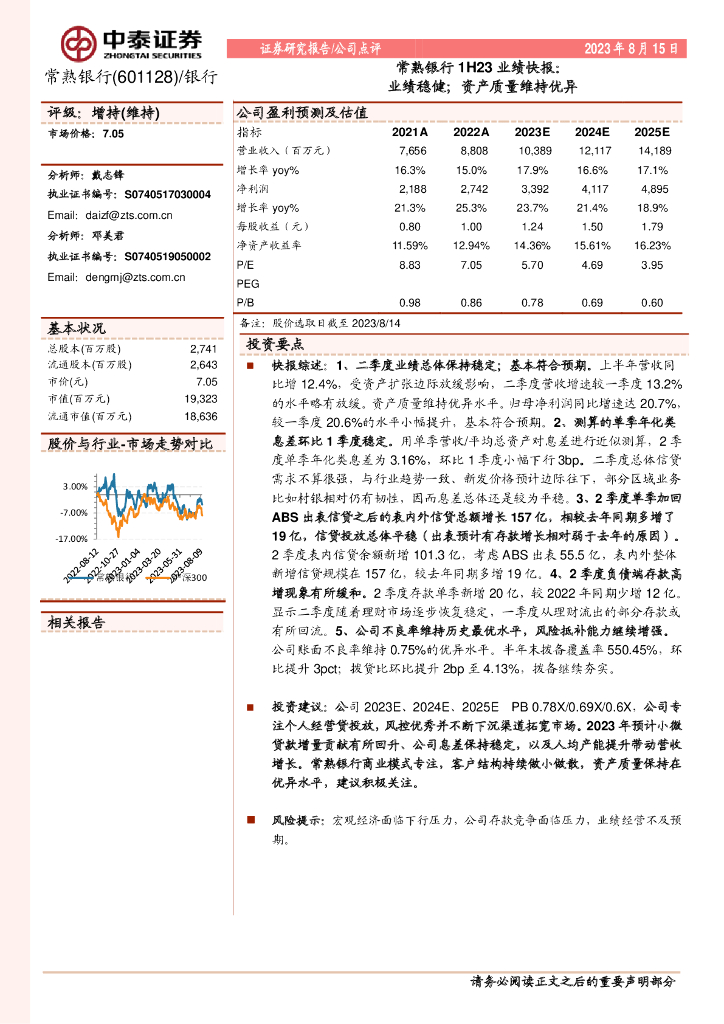 中泰证券:常熟银行(601128)-1H23业绩快报:业绩稳健;资产质量维持优异.pdf
