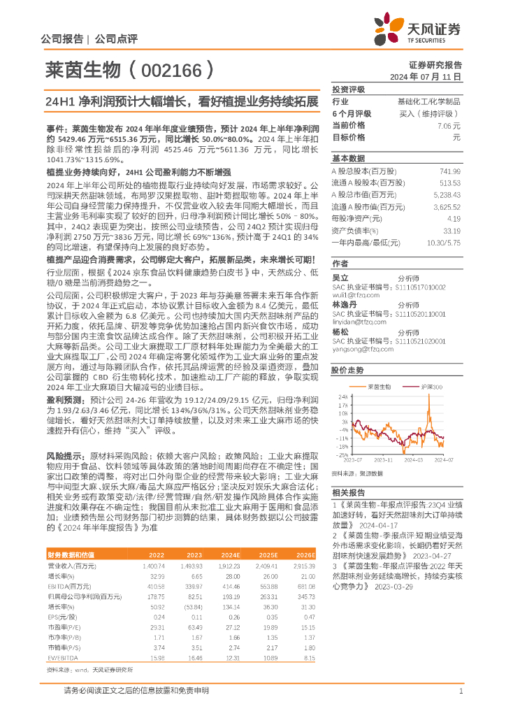天风证券:莱茵生物(002166)-24H1净利润预计大幅增长,看好植提业务持续拓展.pdf