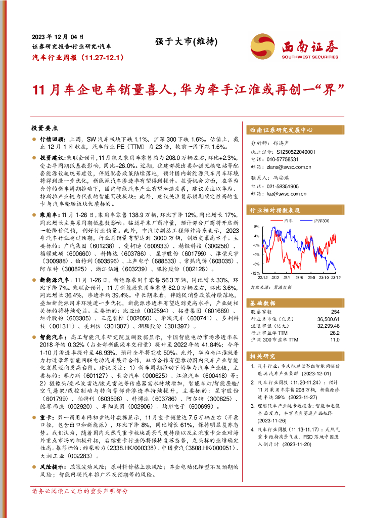 西南证券:汽车行业周报:11月车企电车销量喜人,华为牵手江淮或再创一“界”.pdf