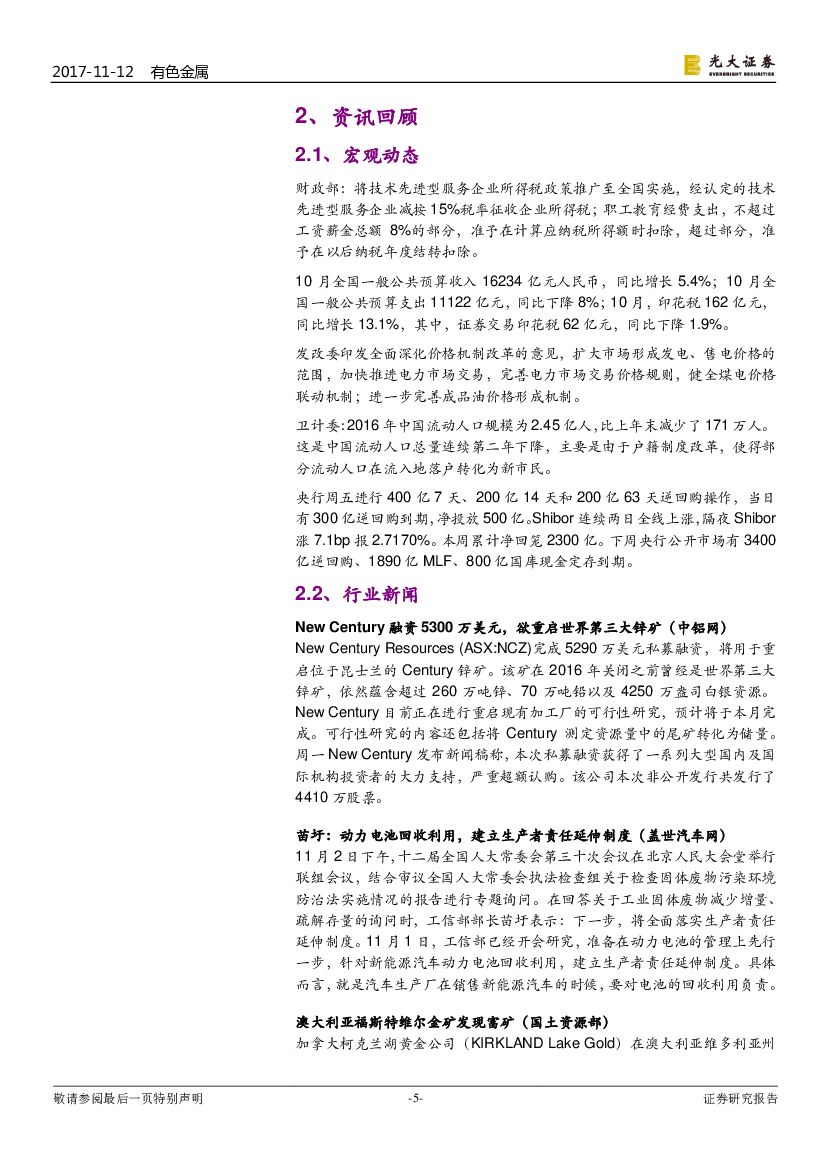 光大证券:有色金属行业周报:大矿投产,锌矿短缺或缓解,逐步关注精锌冶炼环节.pdf
