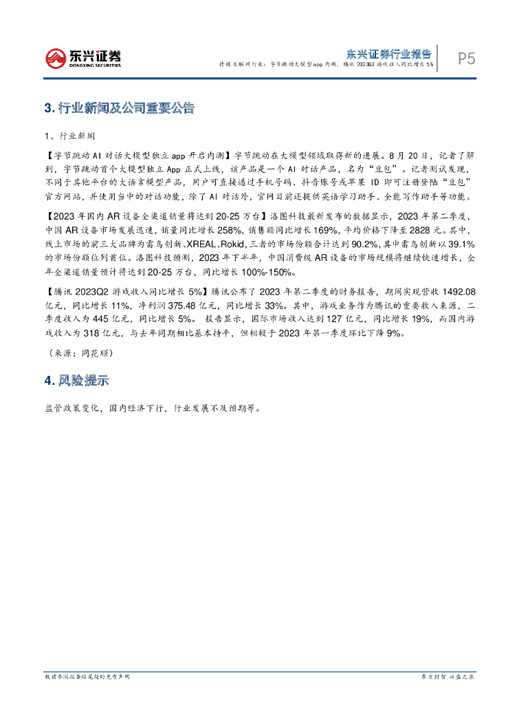 东兴证券:传媒互联网行业:字节跳动大模型app内测,腾讯2023Q2游戏收入同比增长5%.pdf