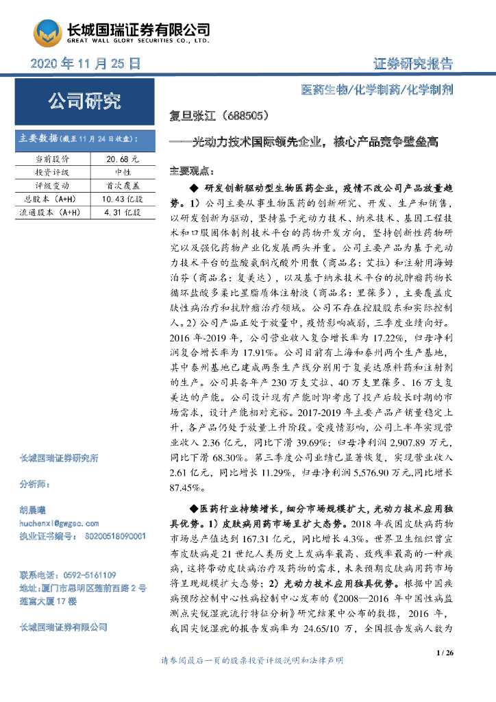 长城国瑞证券:复旦张江(688505)-光动力技术国际领先企业,核心产品竞争壁垒高.pdf
