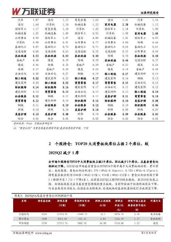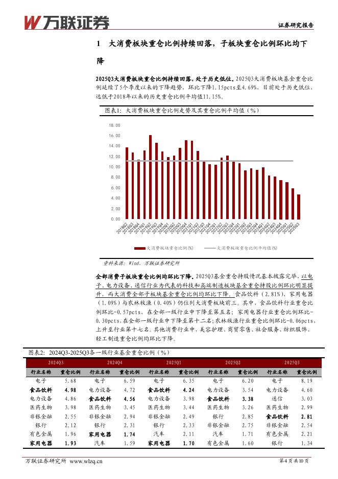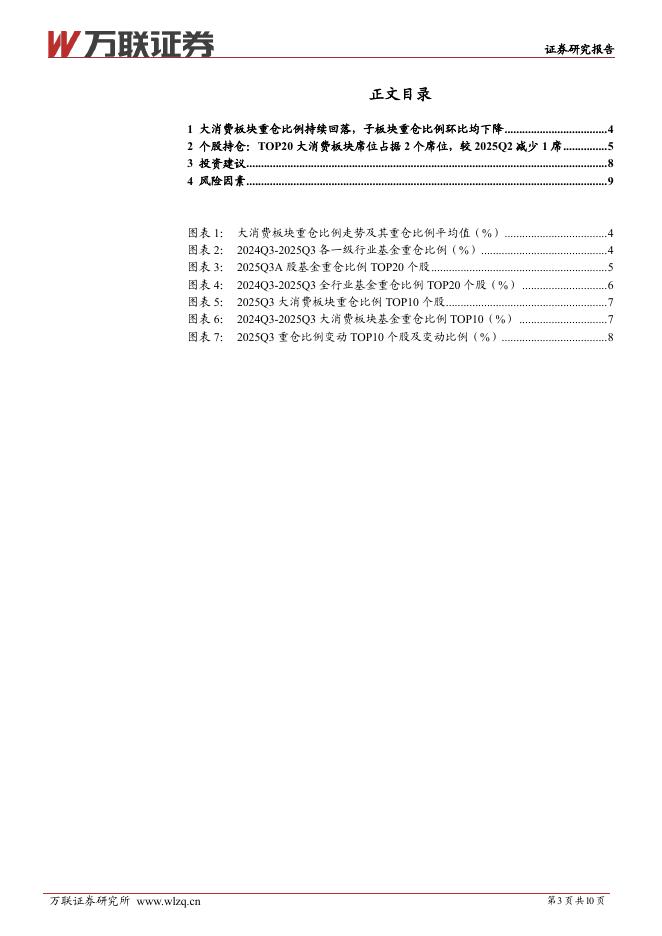 万联证券:大消费行业2025Q3基金持仓分析:大消费板块重仓比例持续回落,子板块重仓比例环比均下降.pdf