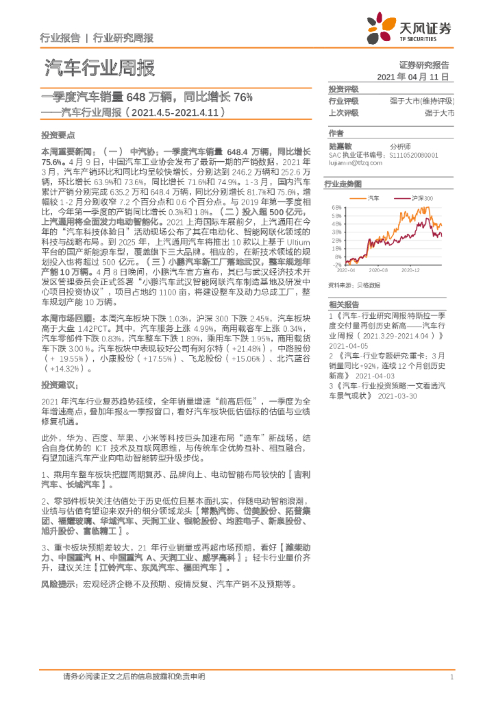 天风证券:汽车行业周报:一季度汽车销量648万辆,同比增长76%.pdf