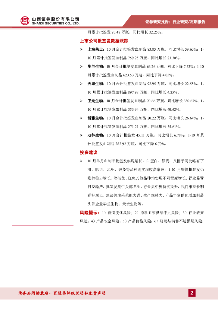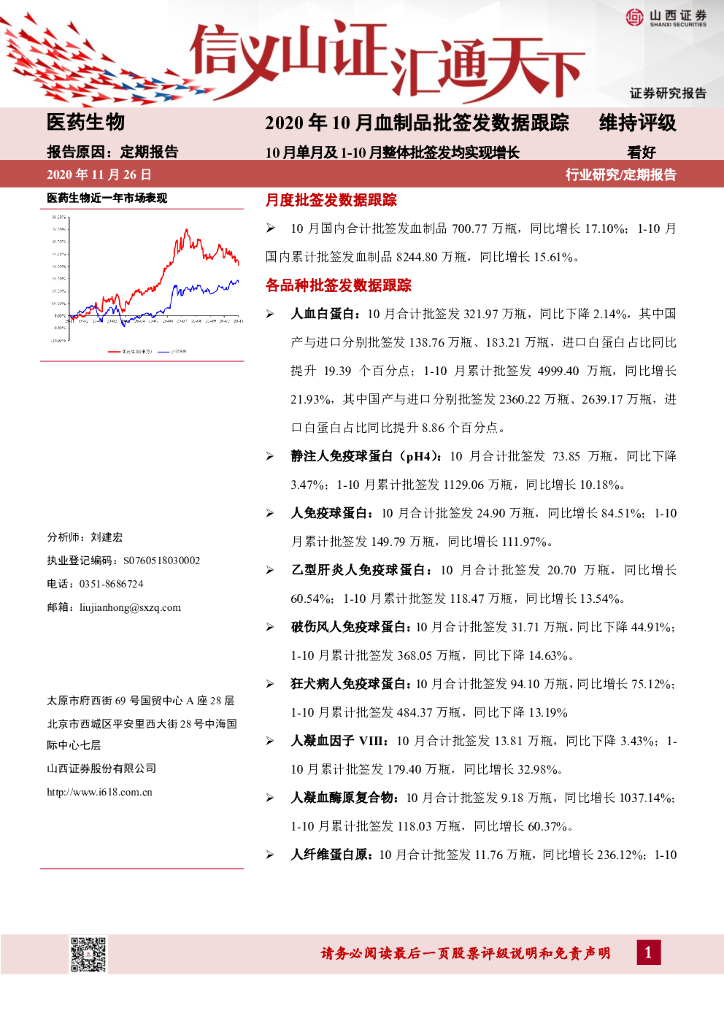 山西证券:医药生物行业:2020年10月血制品批签发数据跟踪:10月单月及1-10月整体批签发均实现增长.pdf