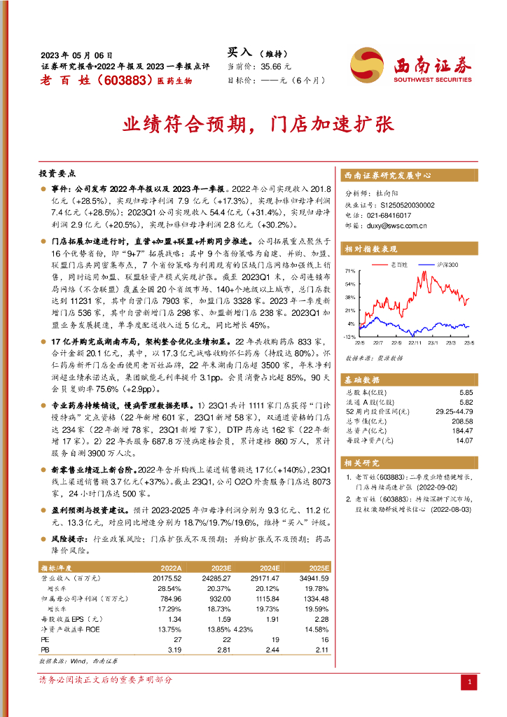 西南证券:老百姓(603883)-业绩符合预期,门店加速扩张.pdf