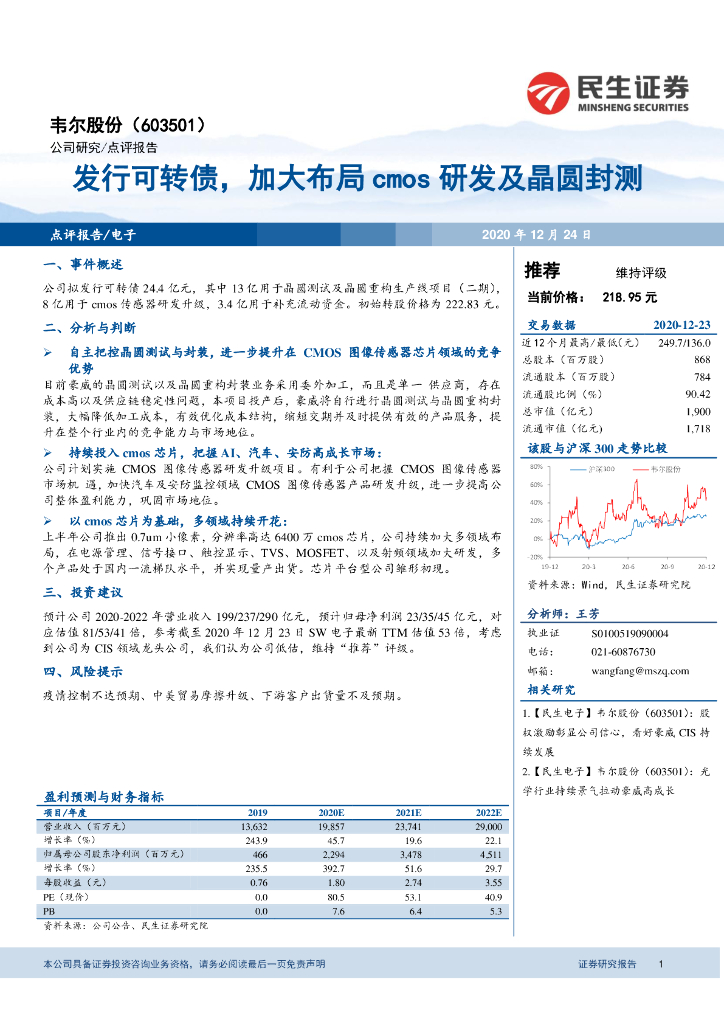 民生证券:韦尔股份(603501)-发行可转债,加大布局cmos研发及晶圆封测.pdf