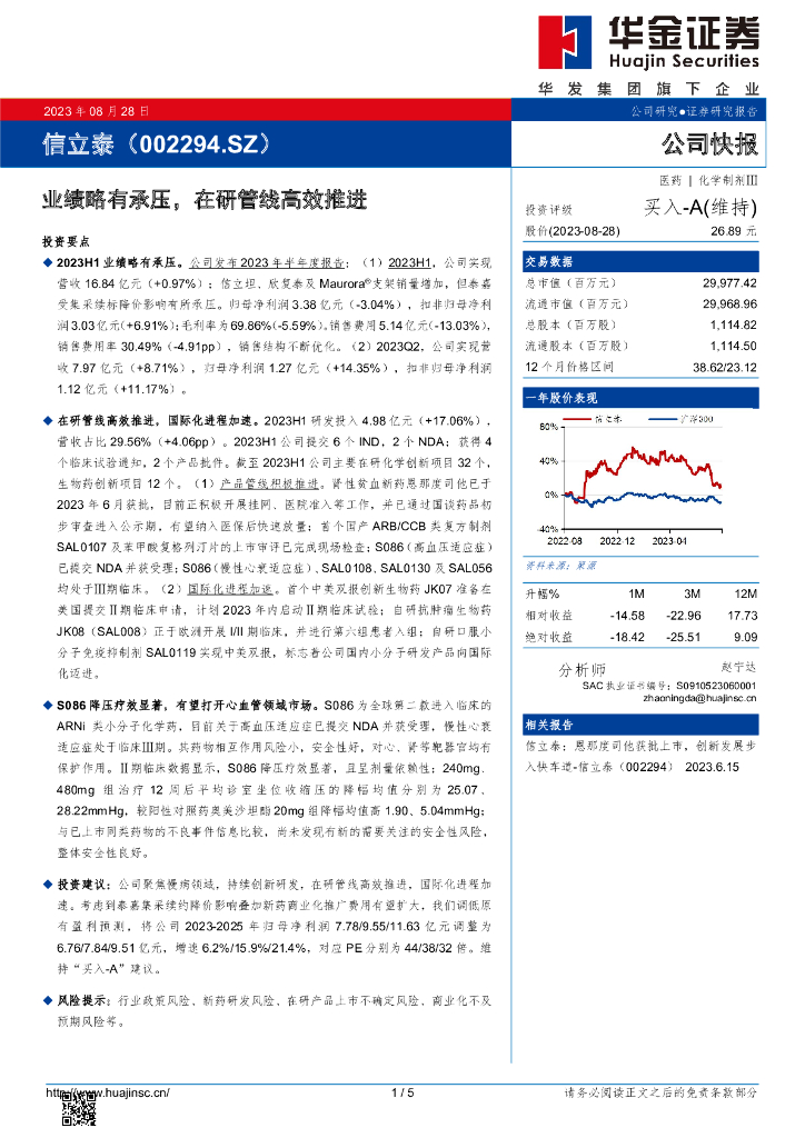 华金证券:信立泰(002294)-业绩略有承压,在研管线高效推进.pdf