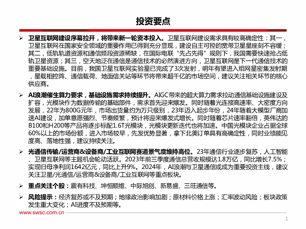 西南证券:通信行业2024年投资策略:卫星通信序幕拉开,AI算力浪潮澎湃.pdf