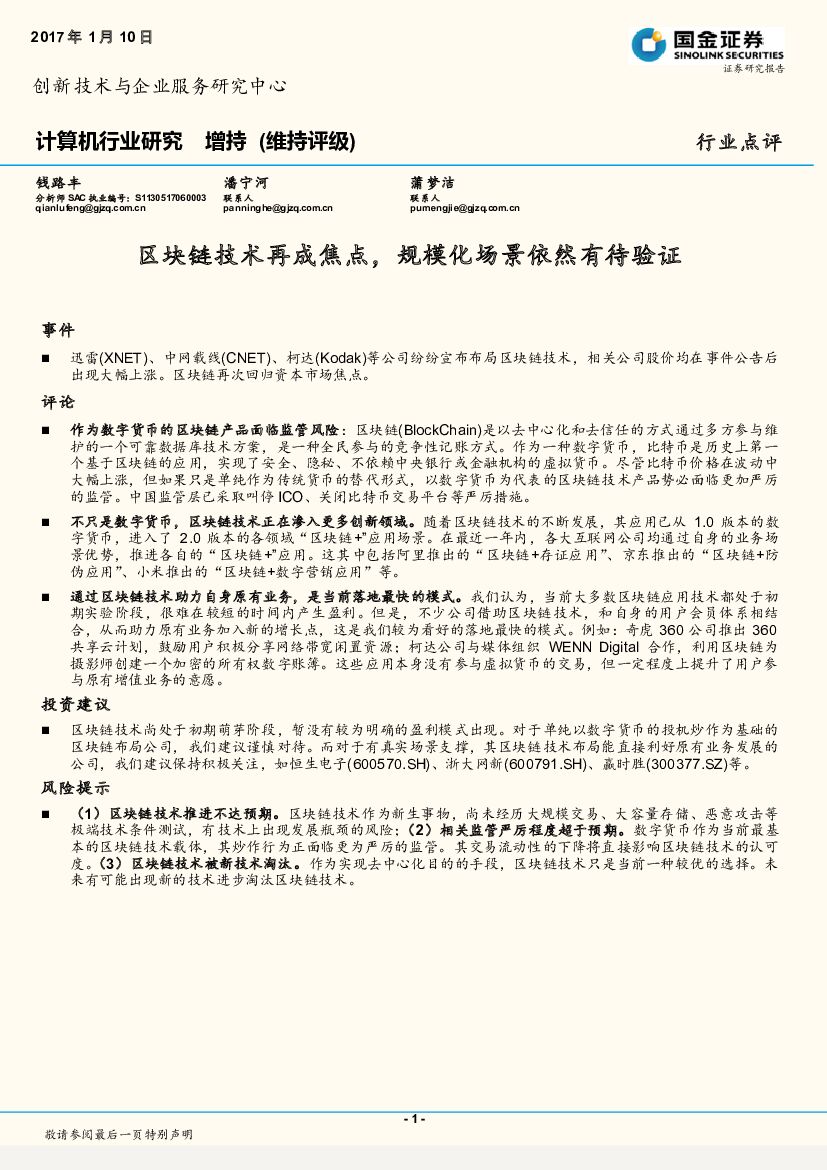 国金证券:计算机行业研究:区块链技术再成焦点,规模化场景依然有待验证.pdf