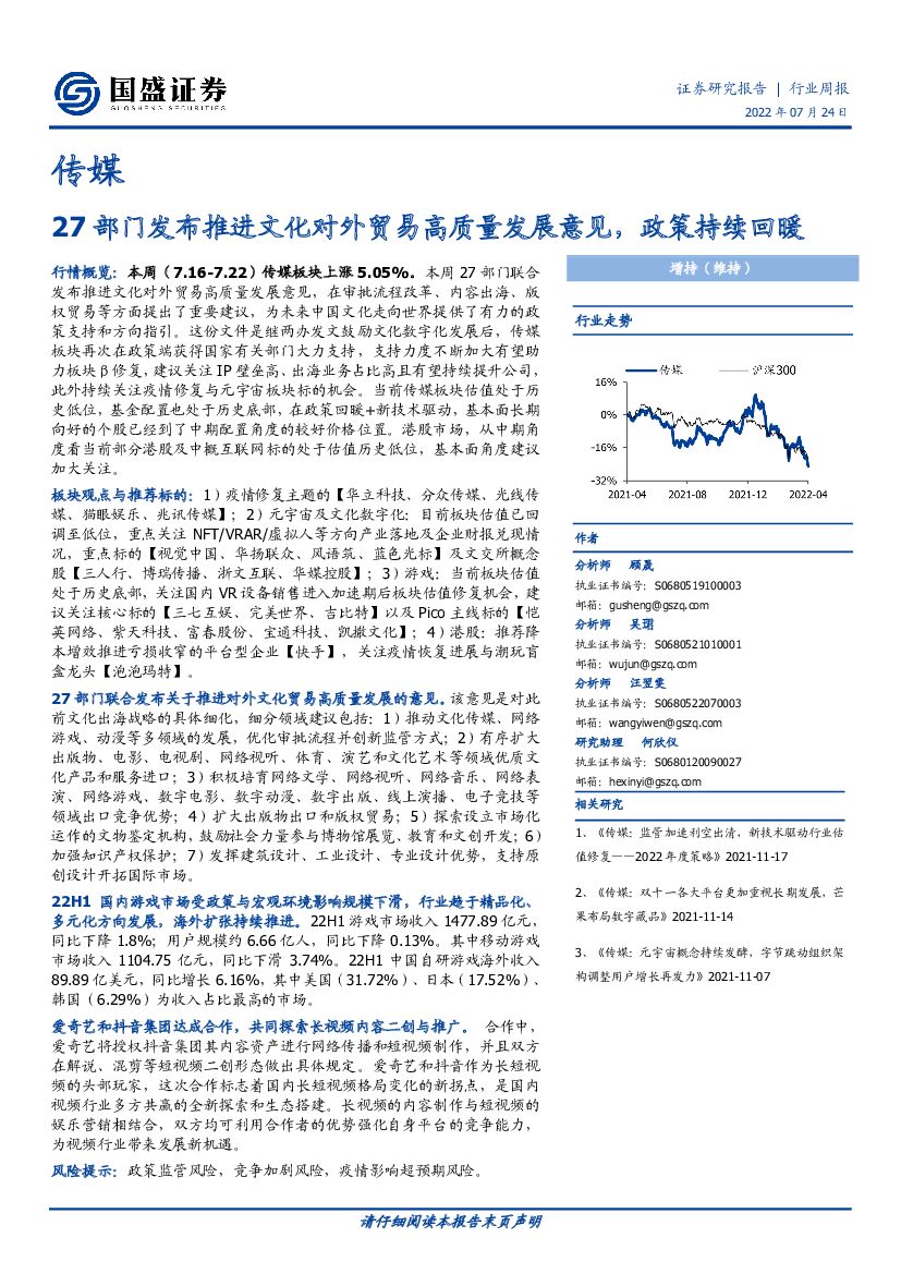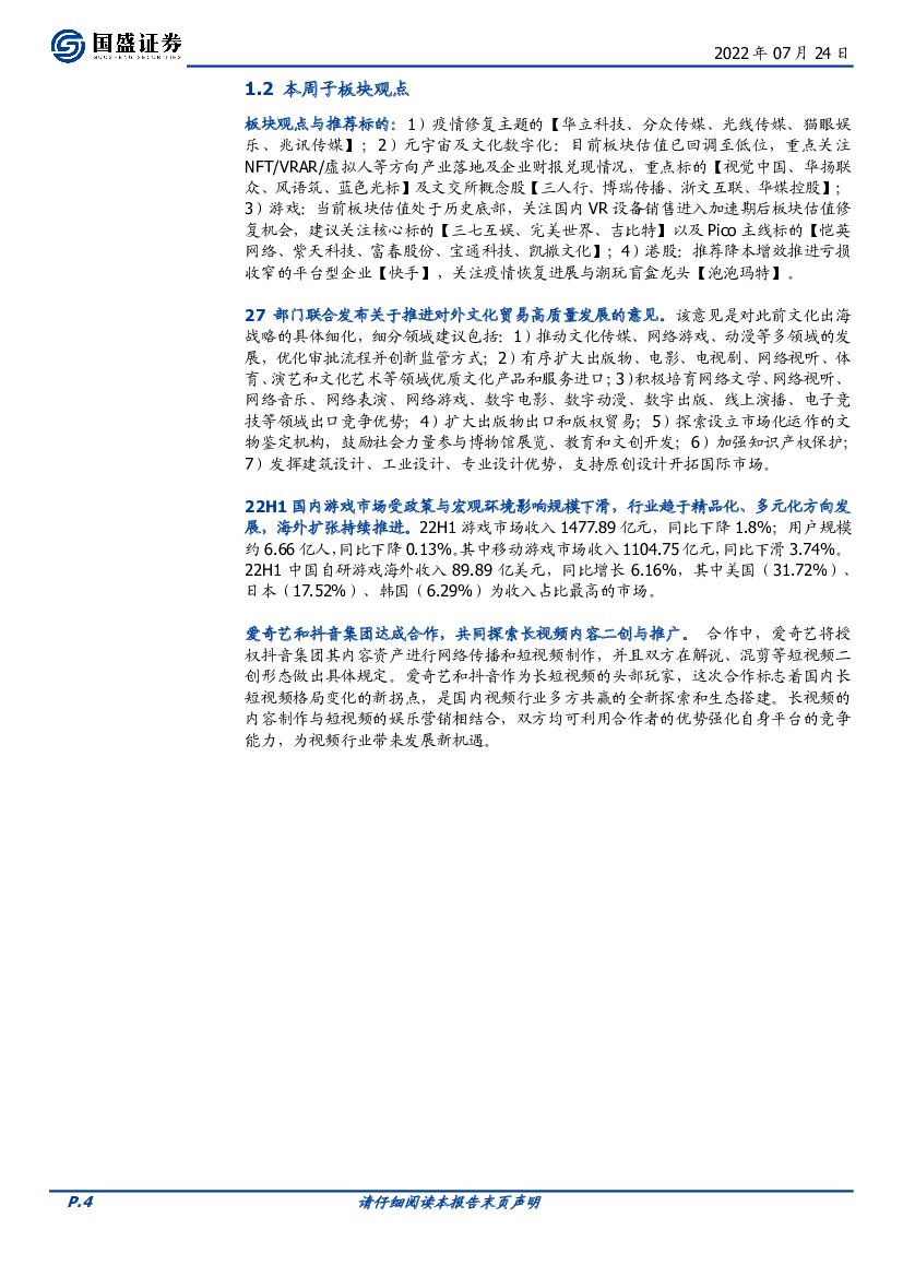国盛证券:传媒行业周报:27部门发布推进文化对外贸易高质量发展意见,政策持续回暖.pdf
