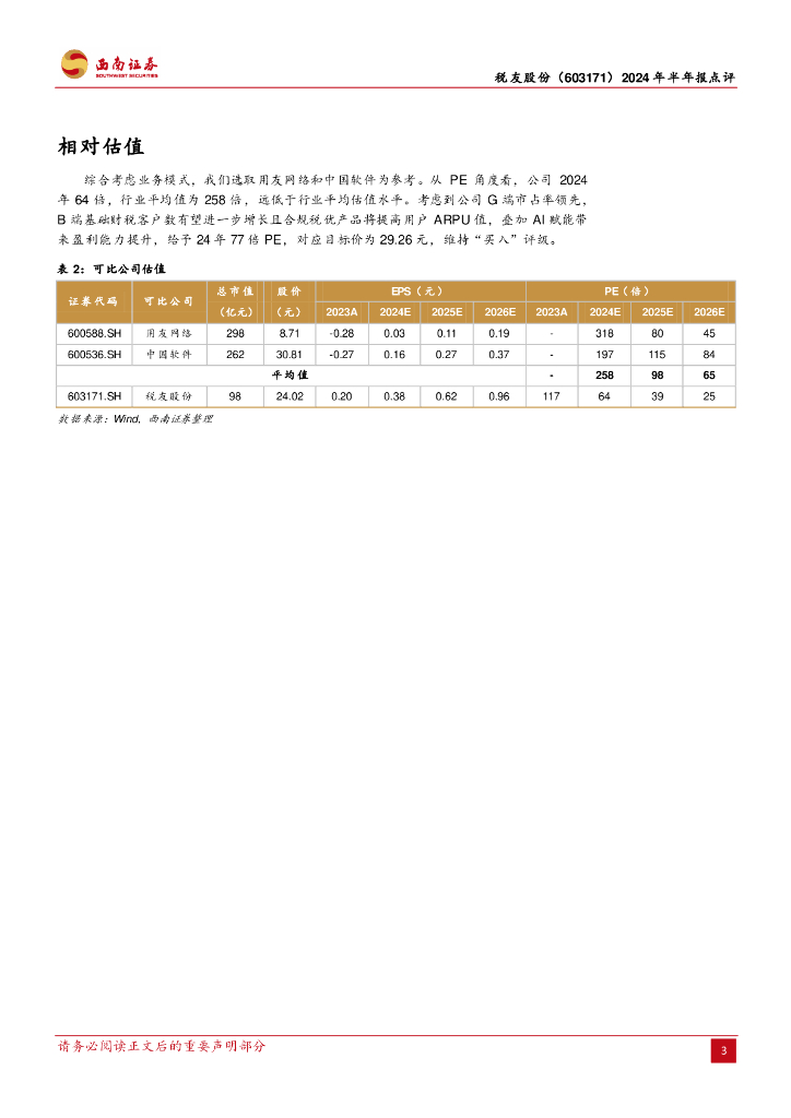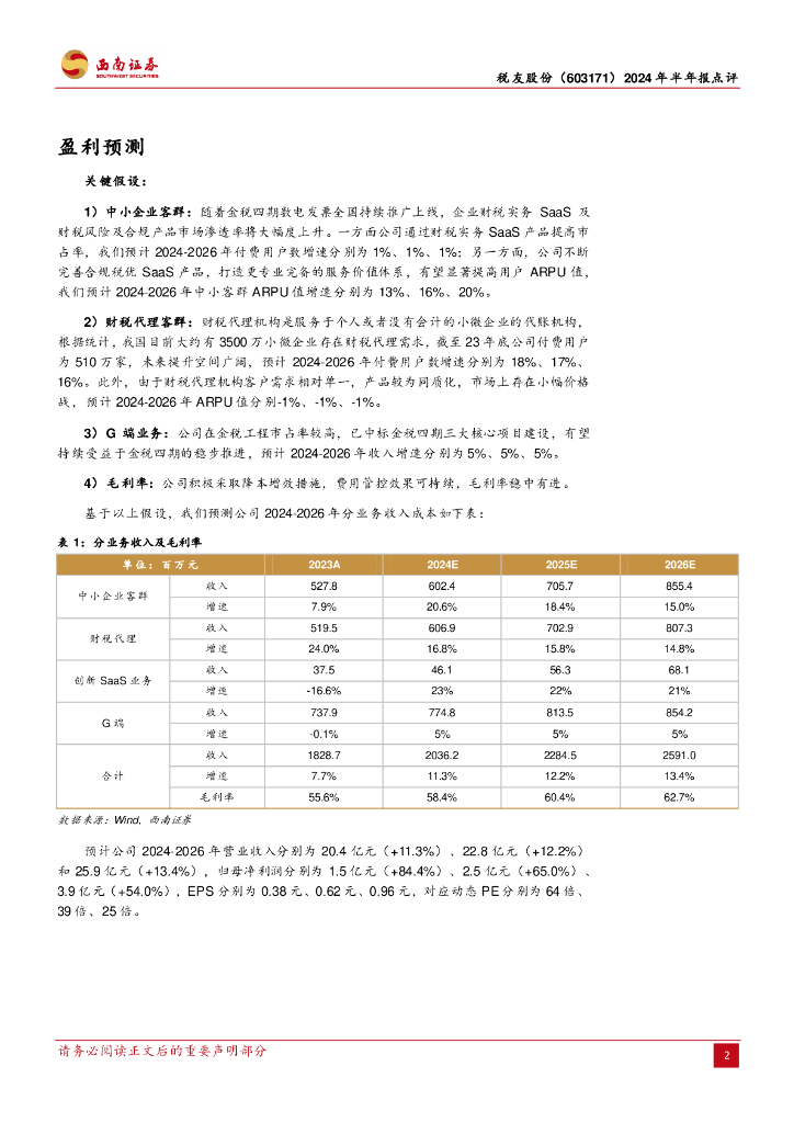 西南证券:税友股份(603171)-2024年半年报点评:业绩稳健增长,B端大有可为.pdf