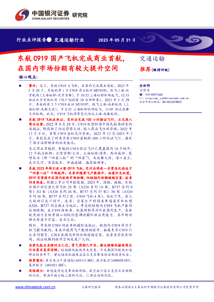 中国银河:交通运输行业点评报告:东航C919国产飞机完成商业首航,在国内市场份额有较大提升空间.pdf