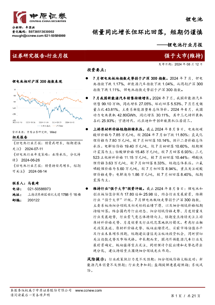 中原证券:锂电池行业月报:销量同比增长但环比回落,短期仍谨慎.pdf