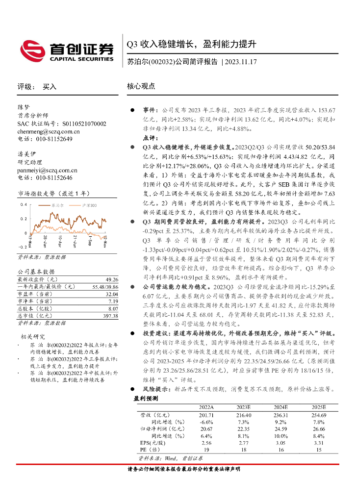 首创证券:苏泊尔(002032)-公司简评报告:Q3收入稳健增长,盈利能力提升.pdf