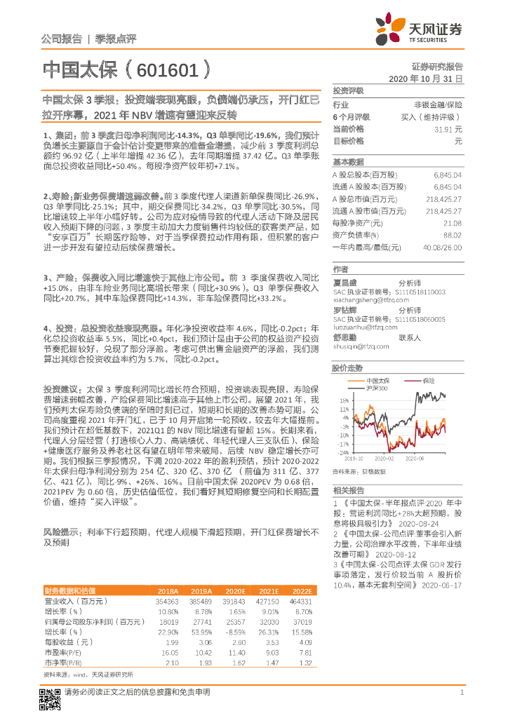 天风证券:中国太保3季报:投资端表现亮眼,负债端仍承压,开门红已拉开序幕,2021年NBV增速有望迎来反转.pdf