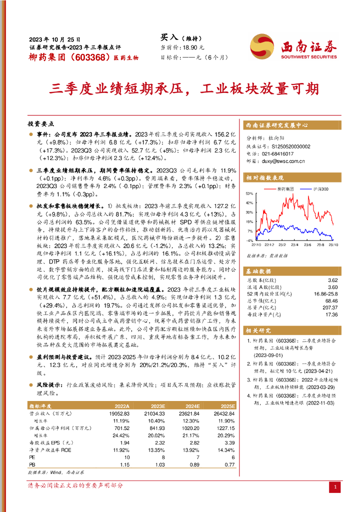 西南证券:柳药集团(603368)-2023年三季报点评:三季度业绩短期承压,工业板块放量可期.pdf