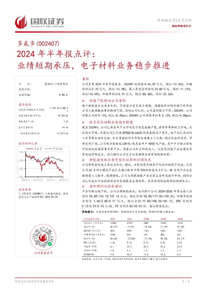 国联证券:多氟多(002407)-2024年半年报点评:业绩短期承压,电子材料业务稳步推进.pdf