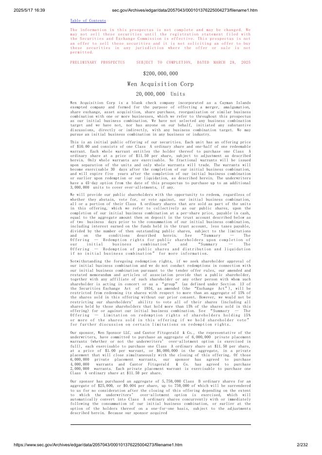 Wen Acquisition Corp美股纳斯达克IPO上市招股说明书.pdf