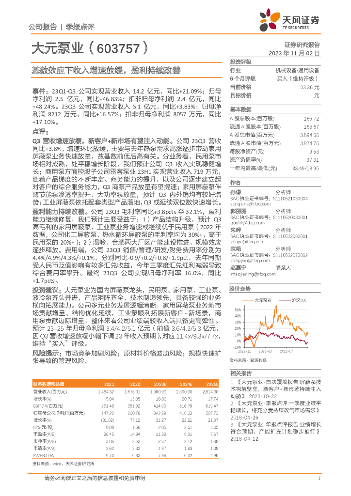 天风证券:大元泵业(603757)-基数效应下收入增速放缓,盈利持续改善.pdf