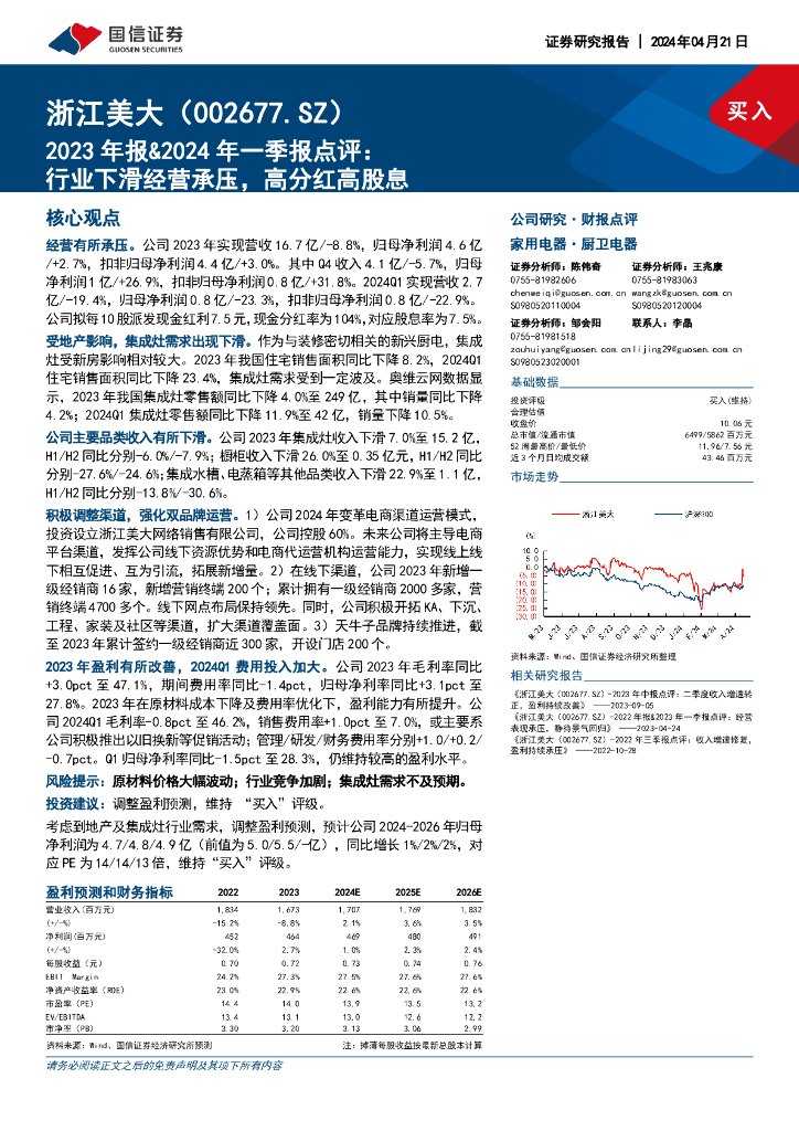 国信证券:浙江美大(002677)-2023年报&2024年一季报点评:行业下滑经营承压,高分红高股息.pdf