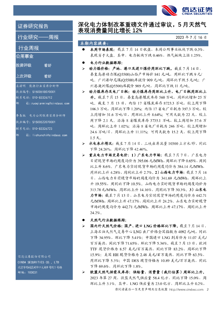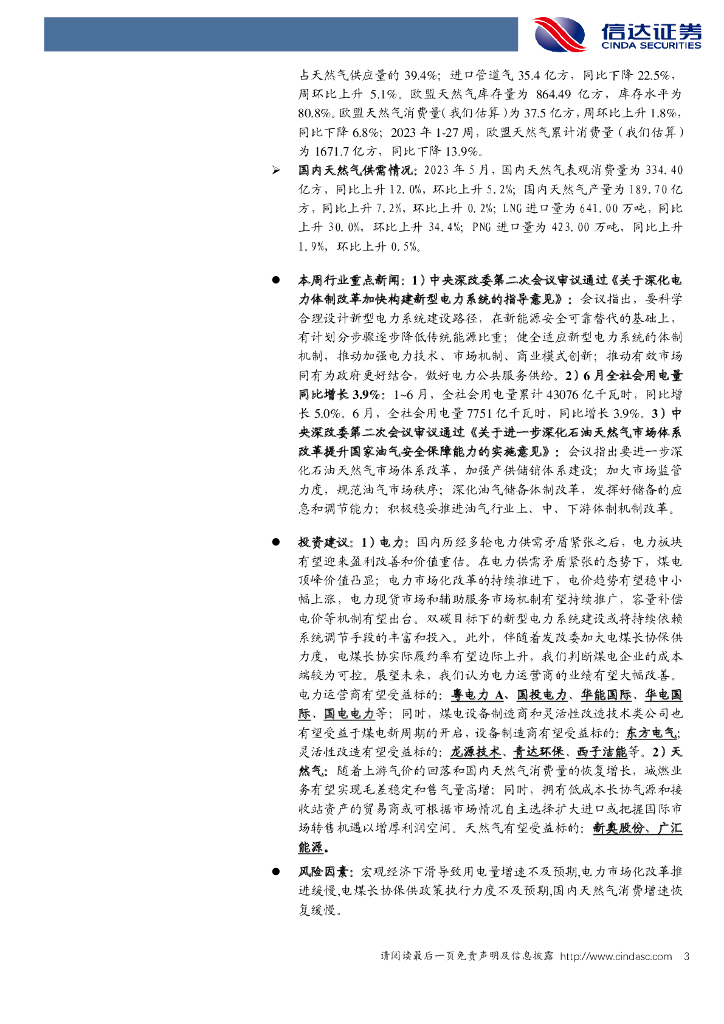 信达证券:公用事业—电力天然气周报:深化电力体制改革重磅文件通过审议,5月天然气表观消费量同比增长12%.pdf