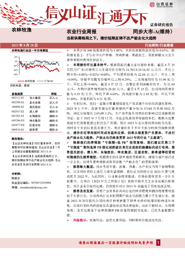 山西证券:农业行业周报:当前供需格局之下,猪价短期反弹不改产能去化大趋势.pdf
