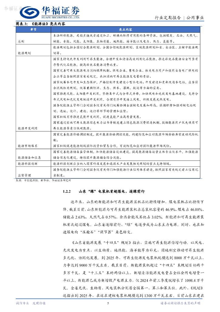 华福证券:公用事业周报:《能源法》出台奠定国内能源发展基础,山东“绿”电装机首超煤电.pdf