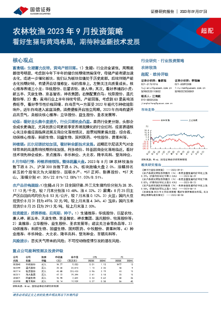 国信证券:农林牧渔2023年9月投资策略:看好生猪与黄鸡布局,期待种业新技术发展.pdf