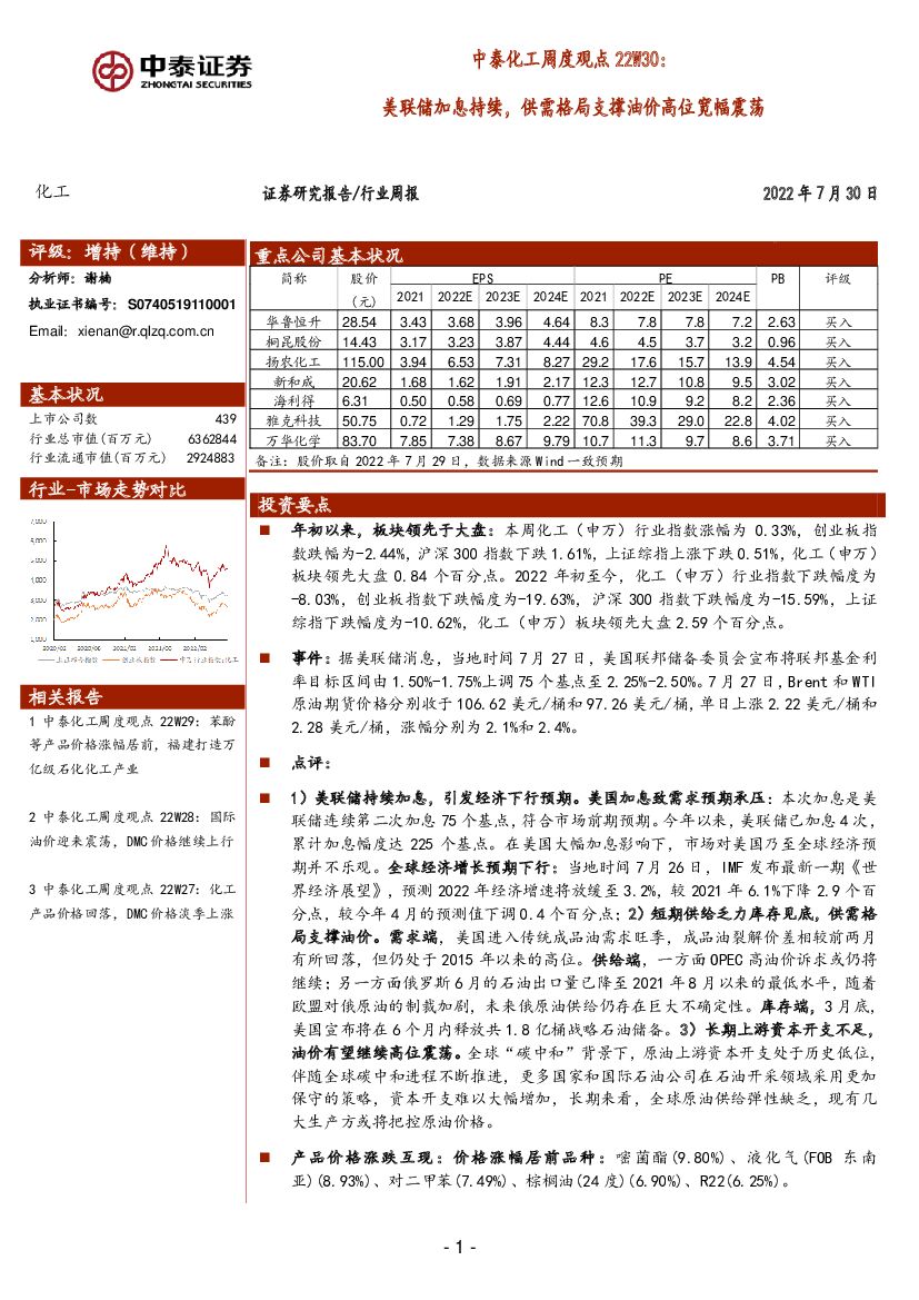 中泰证券:中泰化工周度观点22W30:美联储加息持续,供需格局支撑油价高位宽幅震荡.pdf