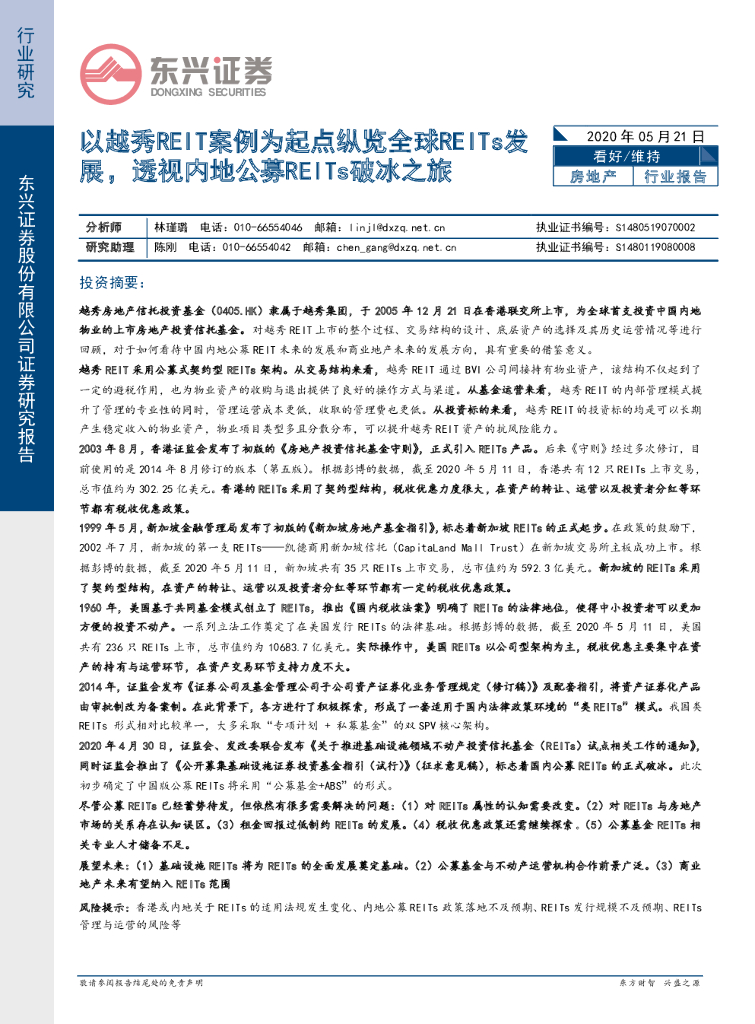 东兴证券:房地产:以越秀REIT案例为起点纵览全球REITs发展,透视内地公募REITs破冰之旅.pdf