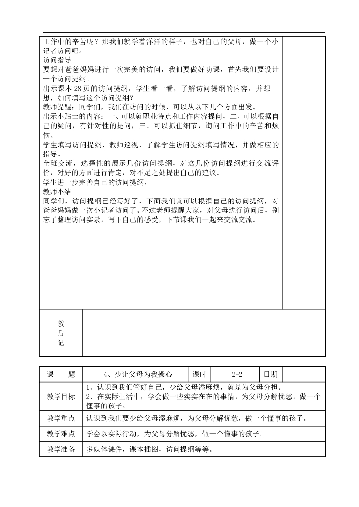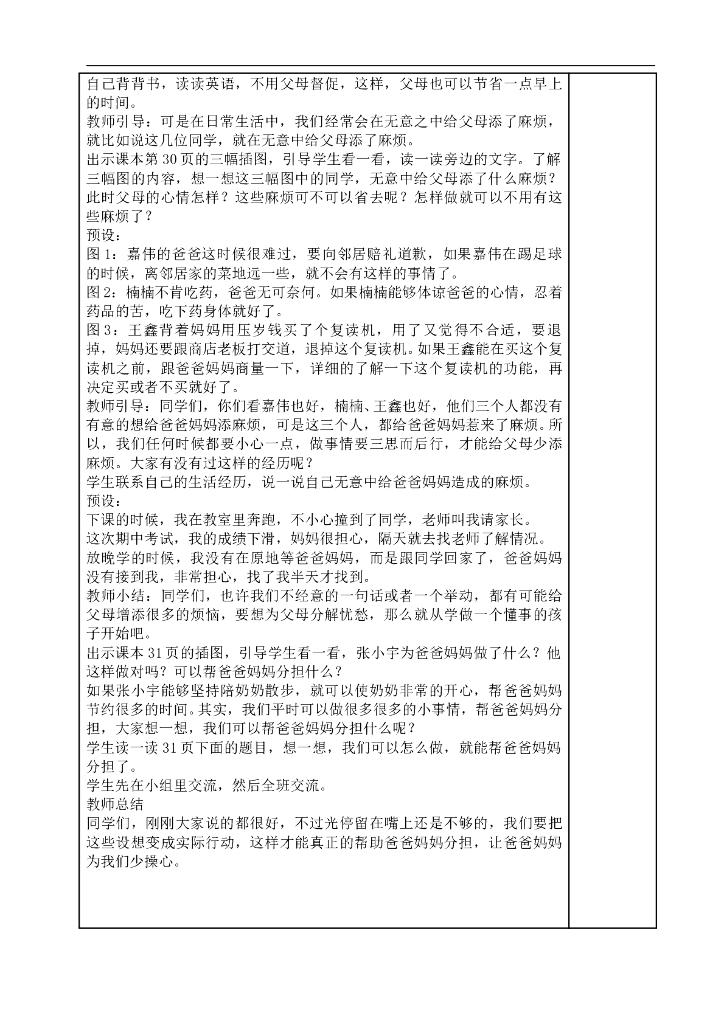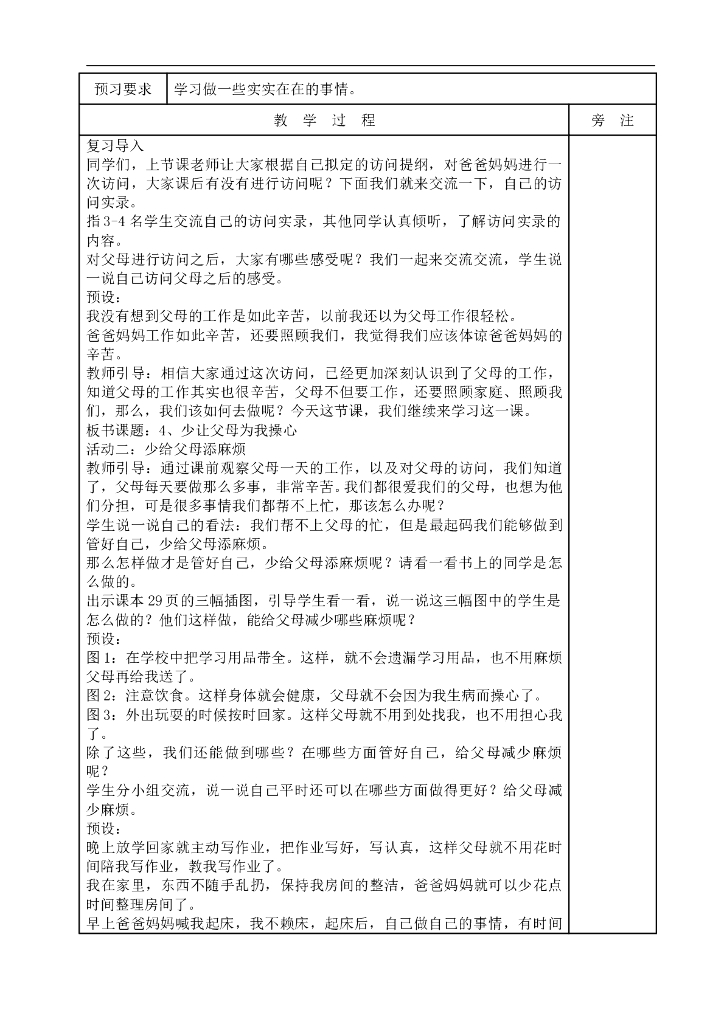 2021四年级上册 人教版小学道德与法治2.1少让父母为我操心 (表格式).doc