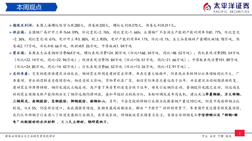 太平洋证券:钢铁周报:短期疫情仍将对普钢基本面构成压力,关注特钢投资机会.pdf