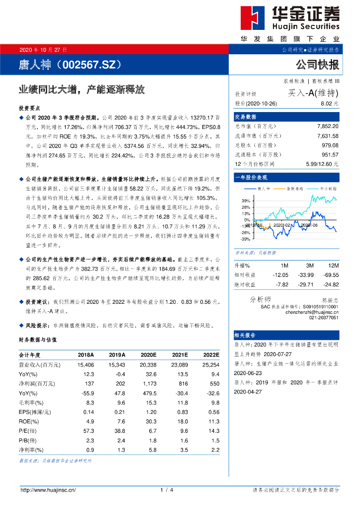 华金证券:唐人神(002567)-业绩同比大增,产能逐渐释放.pdf
