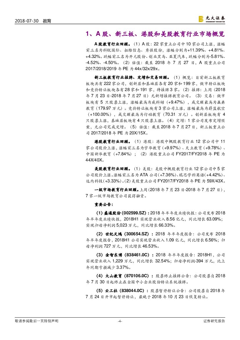 光大证券:教育行业跨市场周报(第38期):教育板块18年中报业绩增长显著,希望教育拟港股上市.pdf