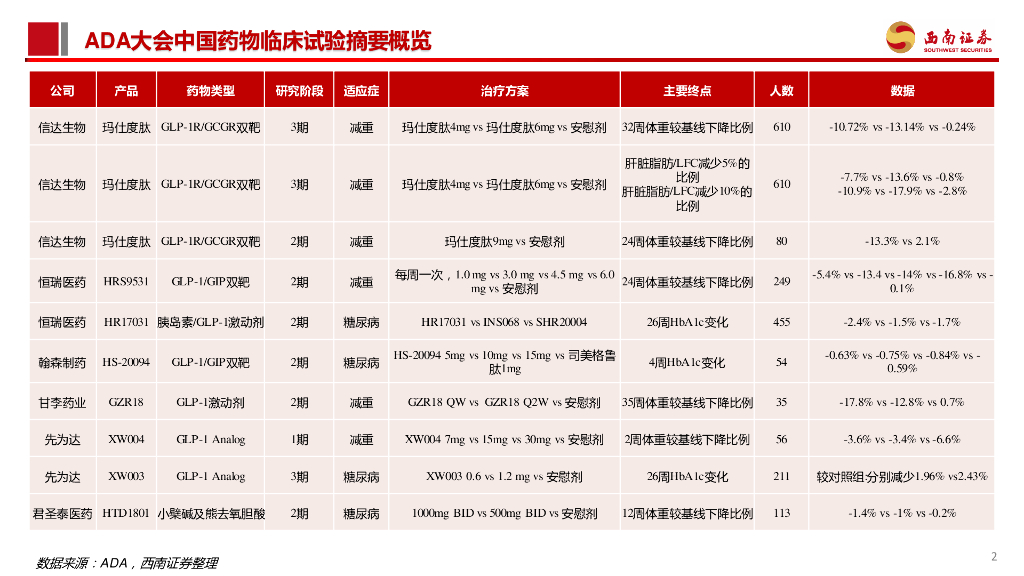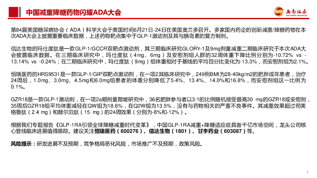 西南证券:医药行业:登台2024年ADA大会,中国减重降糖药物引人注目.pdf